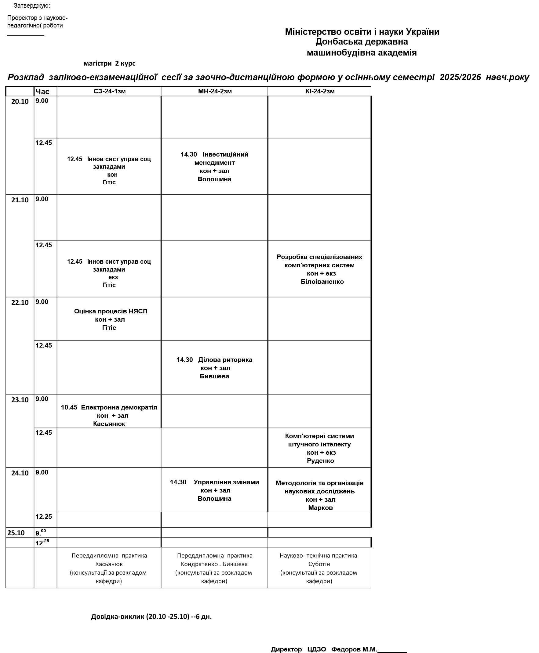 Розклад настановної сесії 1-го семестру для магістрів 1-го курсу (додаткове зарахування з 20.10.2025 р.)