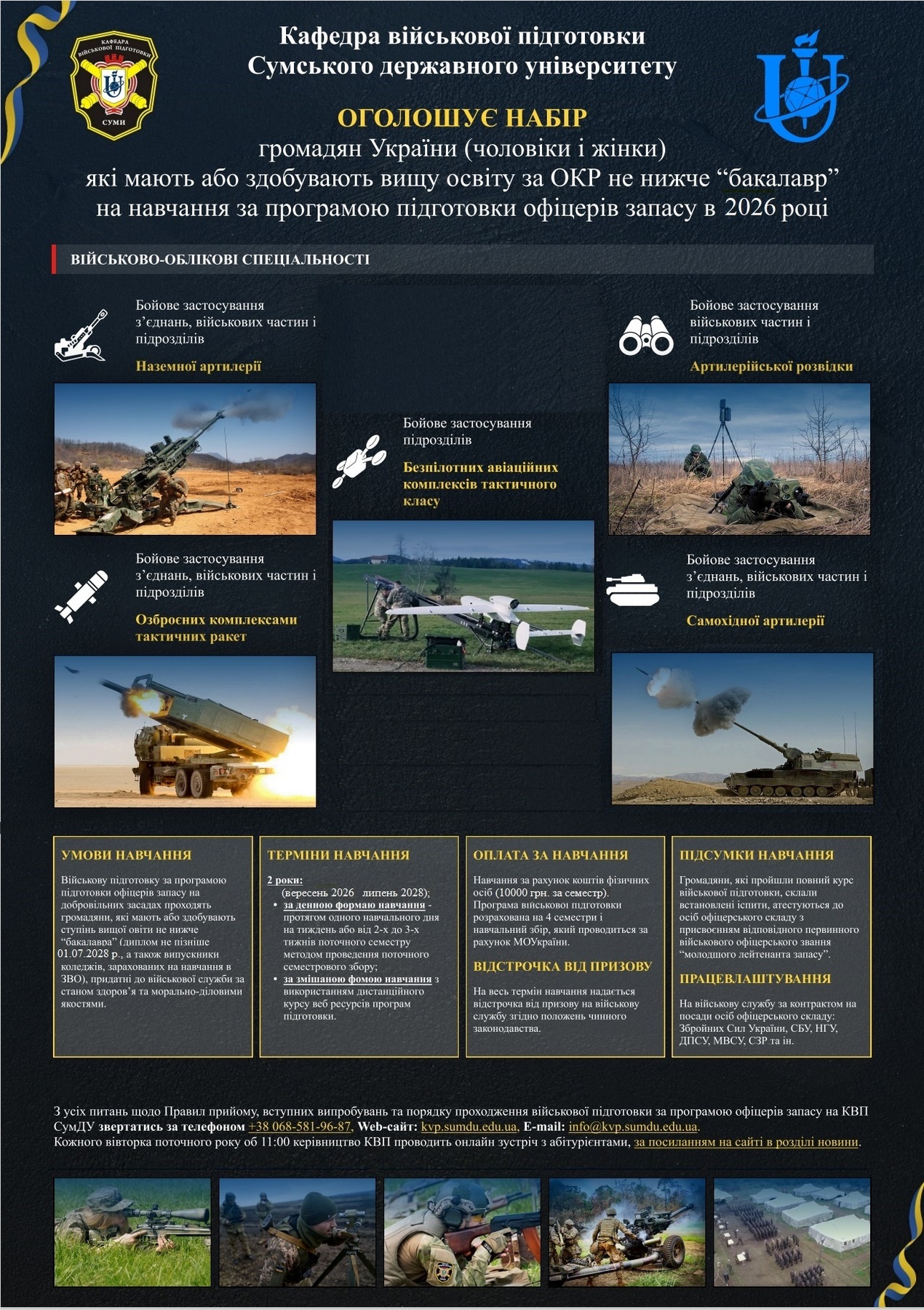 Кафедра військової підготовки Сумського державного університету (КВП СумДУ) оголошує прийом громадян України (чоловіки й жінки), які мають або здобувають вищу освіту за рівнем «бакалавр» або «магістр», на навчання за програмою підготовки офіцерів запасу на кафедрі військової підготовки